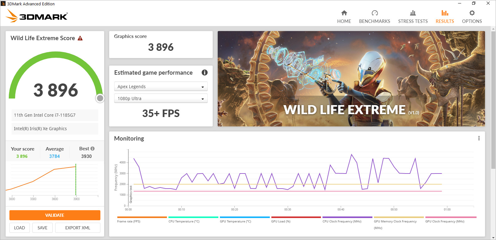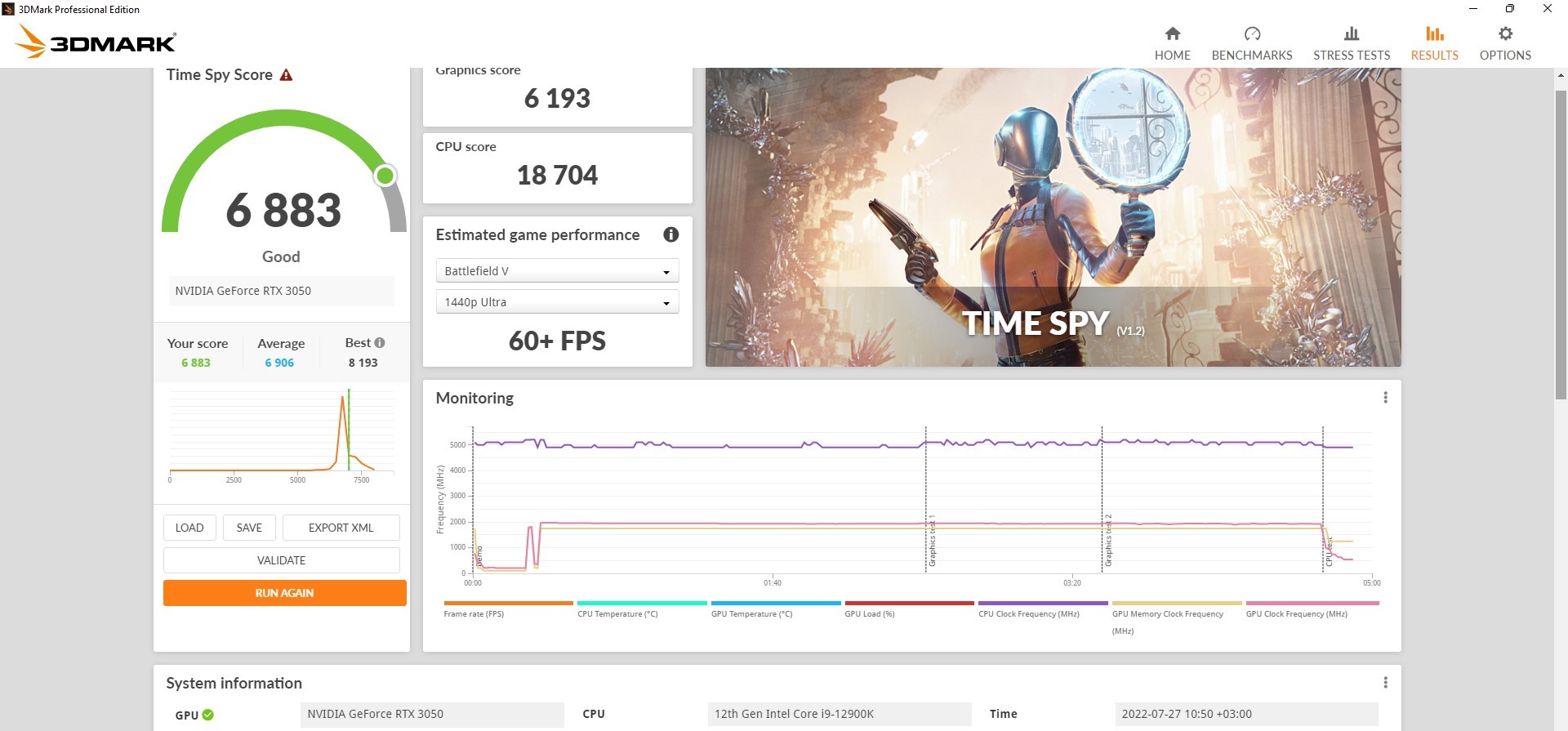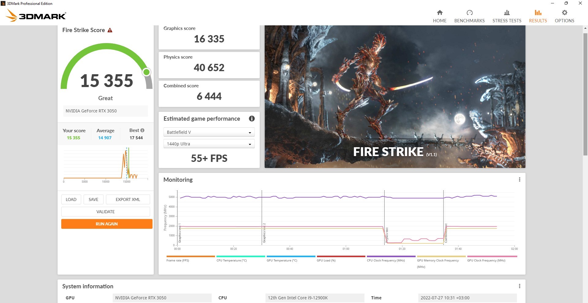 Results is the section of 3DMark that shows the benchmark score for your system. A higher score represents a better performance. You will be able to see the summarized and detailed CPU and GPU scores, the estimated game performance, the settings used for the test, the temperature changes during the test, and the score comparison chart which compares your score with those submitted by other users that used the same combination of processor and graphics card. You can click the link below to download 3DMark for Windows: