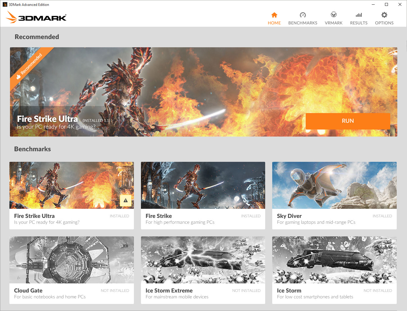 The second section of 3DMark is Benchmark. All the available benchmark and feature tests are located in this screen. Note that the tests that are available depends on the 3DMark editions you have. The ones that appear in color are those that you have installed. On the other hand, the ones that haven’t been installed yet appear in gray.