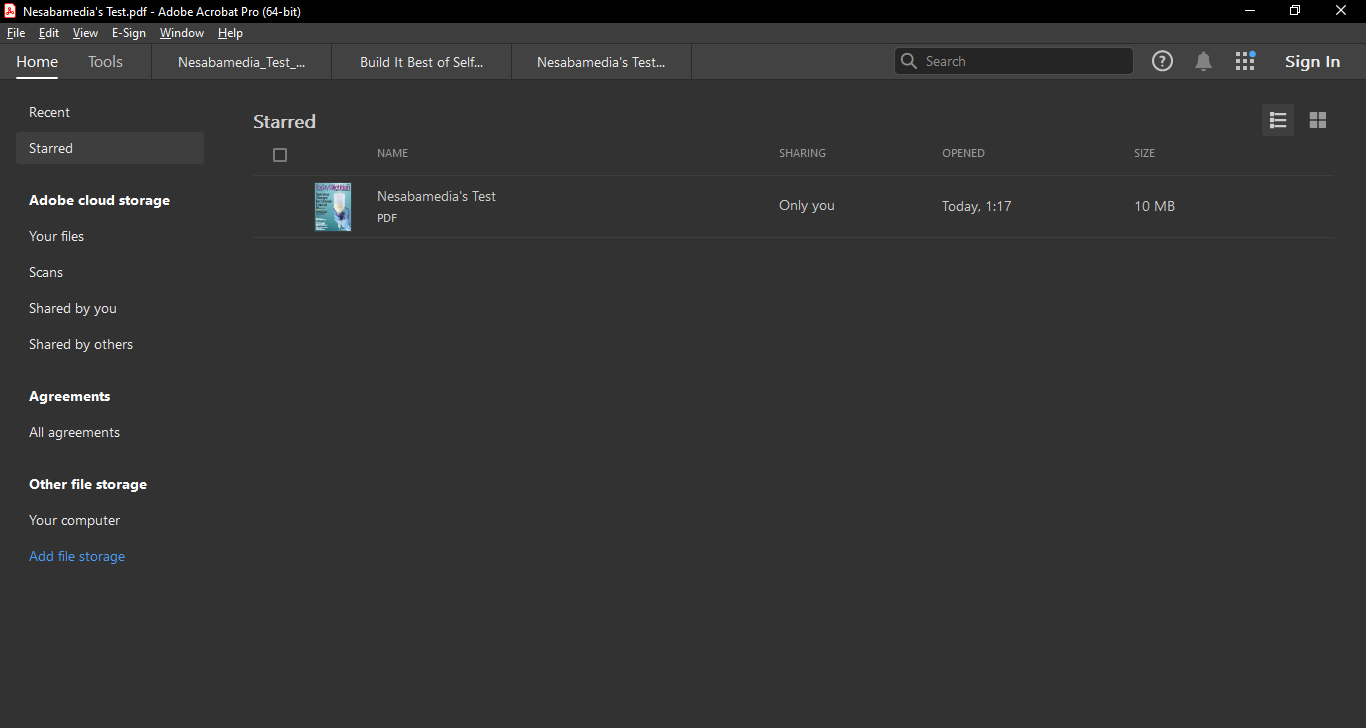 Any file you have starred will be added to the Starred menu in the Home view, which can be displayed in thumbnail or list mode. Clicking on a starred item opens a panel that shows its cover, details, and some shortcuts to edit, export, organize, and share it, among others.