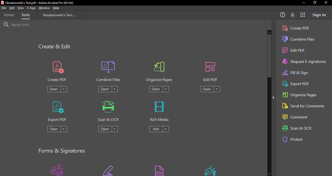 On the right side is a panel consisting of various useful tools to work with your PDF files. These include but are not limited to Create PDF, Combine Files, Edit PDF, Fill & Sign, Export PDF, Organize Pages, Comment, Send for Comments, Scan & OCR, and Protect.