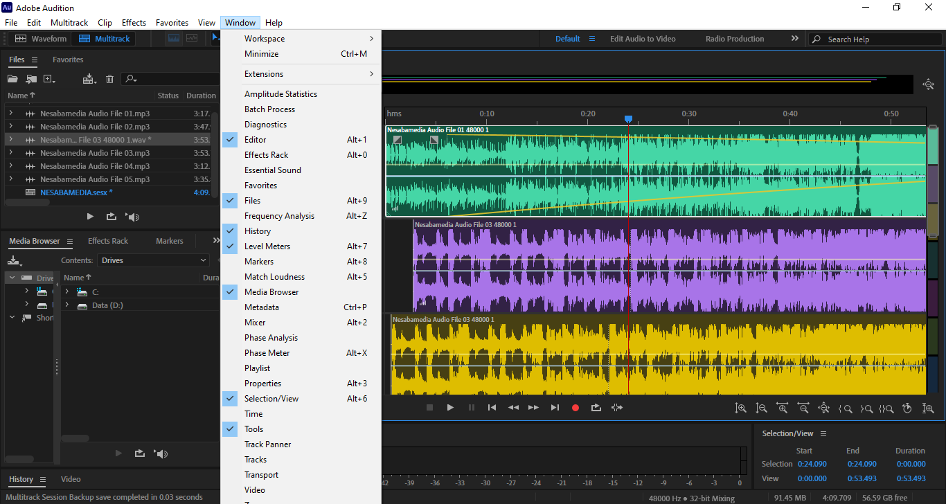 Its user interface has been optimized for audio editing, but you can customize it to suit the way you work. The customization can be done by rearranging the panels. Once you finish the customization, you can save it as a new workspace. After that, you can keep customizing it and saving each customization as a different workspace. This flexibility allows you to have several workspaces, each of which is personally optimized for a particular task.