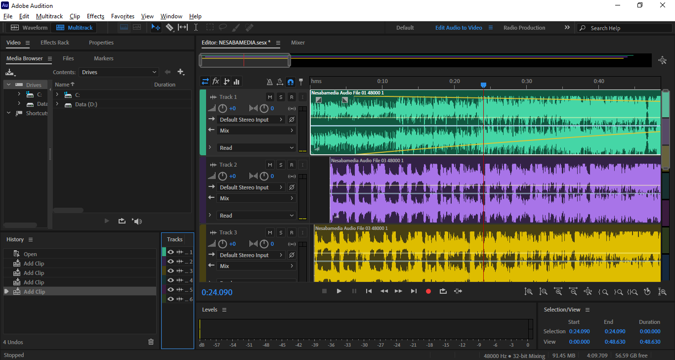 Adobe Audition 2022 provides Multitrack Editor to mix tracks on a timeline. There is no limit to how many clips each track can contain. You can use as many clips as possible as long as your hard drive has enough space and your PC has the power to process all of the clips.