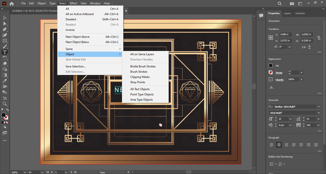 Its Select Same Text is a time saving feature as well. If you have multiple text objects that share the same properties in a document, you can change them all in one go simply by selecting one of them, click Select > Same, and then click one of the text properties like font family, font size, text fill color, text stroke color, or any available combination of the properties. Illustrator will select all text that have the same characteristics and apply any change you make to all of them at once.