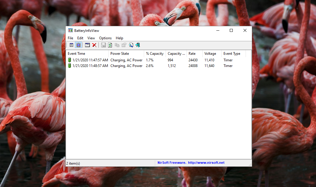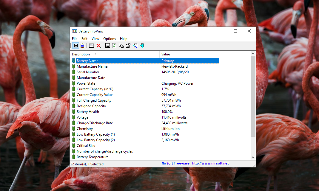 Despite its small size, BatteryInfoView delivers a surprising amount of data, which it collects from the battery’s built-in sensor data and presents it in a tidy table, letting you see everything from charge level and capacity to wear level and voltage.