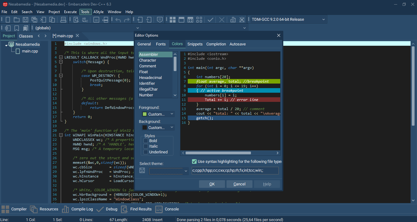 The center of the screen is the code editor, where you write your C or C++ programs. By default, even though the interface is dark, the editor has a white background. The color can be changed by selecting a dark theme from Tools > Editor Options, where several themes are available to choose from. Alternatively, you can edit the visual styles manually, like changing the number color from green to yellow, the font style from Consolas to Courier New, and so on.