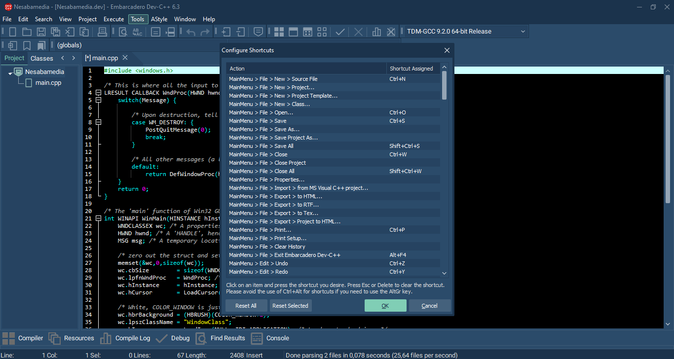 Dev-C++ has a wide range of keyboard shortcuts, which you can find in Tools > Configure Shortcuts. Many of them have been assigned to actions. To change any of them, or to assign a new shortcut to any of the actions that don’t have one yet, select it and press your preferred keyboard shortcuts.