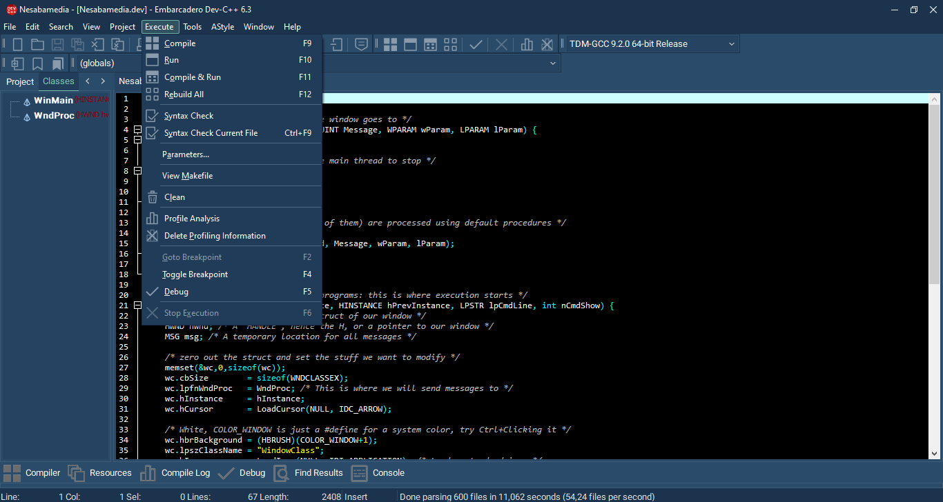 Dev-C++ opens quickly even on a less powerful PC. It sports a dark blue interface, revealing the typical layout of a full-featured IDE, with buttons, menus, options, tools, and panels grouped neatly and intuitively.