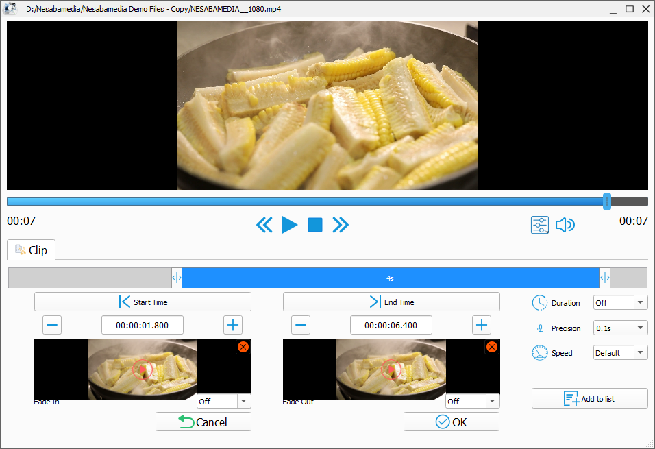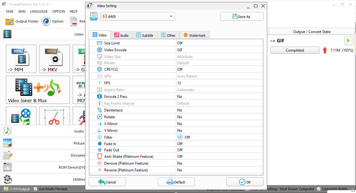 You can, for example, limit the output size; select the encoder, bitrate, resolution, frame per second (FPS), and aspect ratio; apply fade in and fade out; deinterlace and rotate video.
