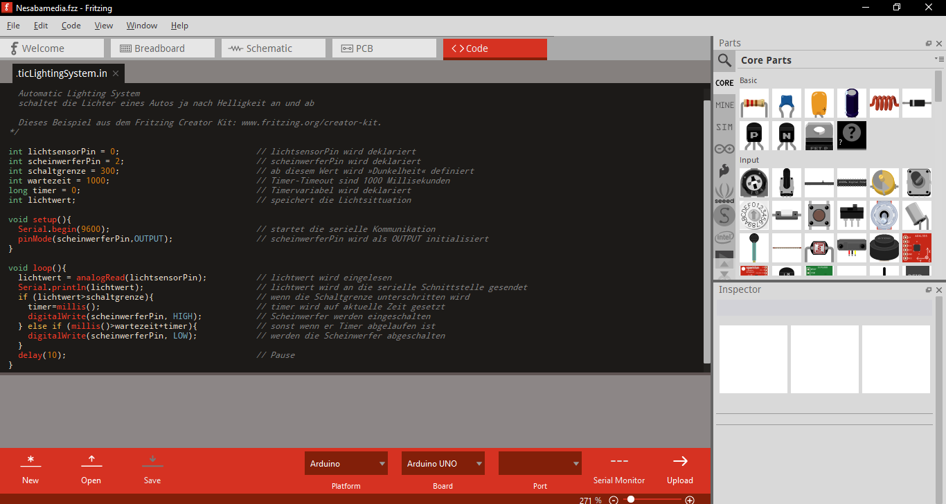 The last tab in Fritzing is the Code view. Added in version 0.9.1b around 2014, the view is mainly intended for Arduino-based projects. It’s basically a code editor that lets you write, compile, and upload microcontroller code from within the program. You might have to do some manual configuration for it to work as intended, however.