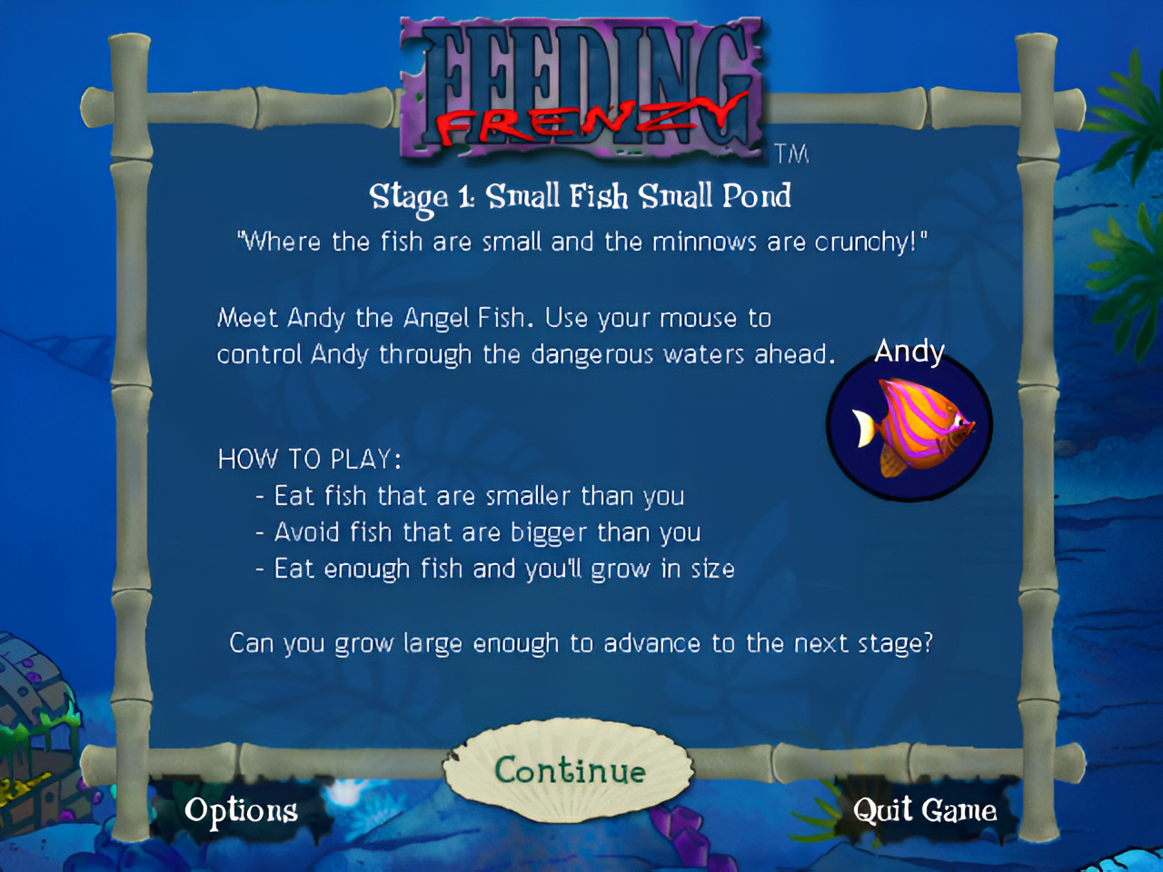 Feeding Frenzy is a no-brainer game to help you out of boredom. In this game, you control a fish whose growth spurt depends on how many fishes it eats. The more it eats, the fatter it becomes. When it gets bigger, it can eat other fishes which was previously impossible when it was still a small marine predator.