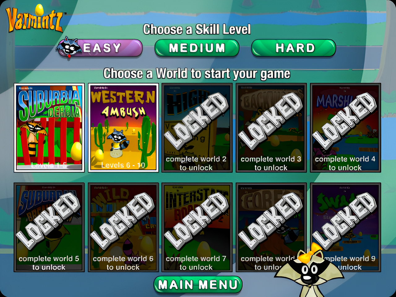 Varmintz Deluxe offers 10 distinct worlds to explore, each broken down into six levels that steadily ramp up the challenge. Right from the start, you can dive into Suburba Derbia and Western Ambush, two worlds that set the tone with playful yet tricky layouts. The other eight worlds, however, remain locked until you have proven your skill by guiding all five raccoons safely back to their nest.
