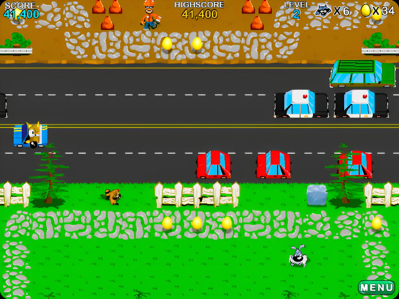 Varmintz Deluxe: A fast-paced game that challenges players to guide a band of raccoon-like characters across treacherous streets and suburban backyards to collect golden eggs and reach their den.