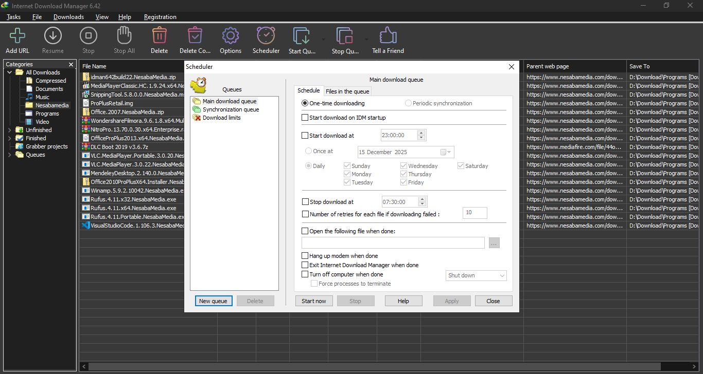 The list of features that Internet Download Manager offers doesn’t end yet. There is also a built-in scheduler that lets you decide when and how you want to download some files from the web.