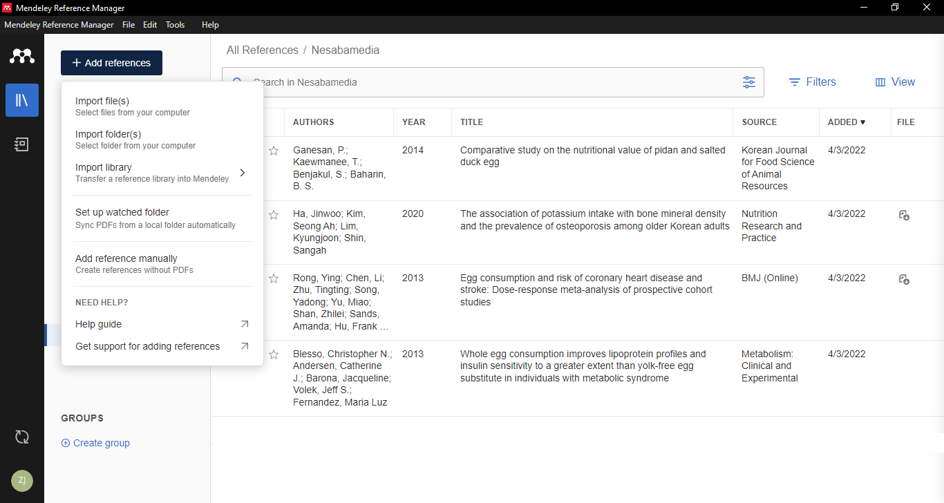 Adding a document can also be done by clicking the Add Files button. If you have a document that is not a PDF, you can create an entry for it by entering the details of the document manually. There is also an option to transfer your library from Zotero and other citation management software to Mendeley Desktop.