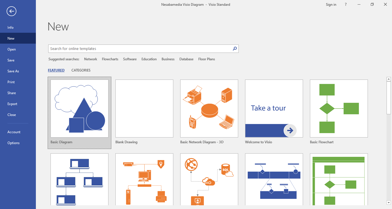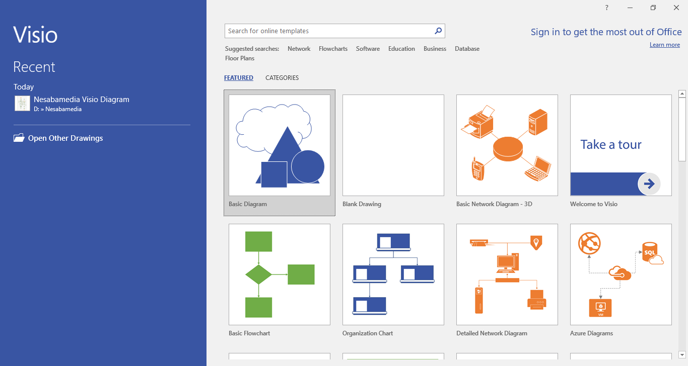 Right from the start you get to choose between making your own diagram or choosing one of the few templates available. If you let Visio connect to the internet, you’ll get several more templates for free such as Data Flow Diagram, Rack Diagram, Wireframe Diagram, Audit Diagram, BPMN Diagram, and Gantt Chart.