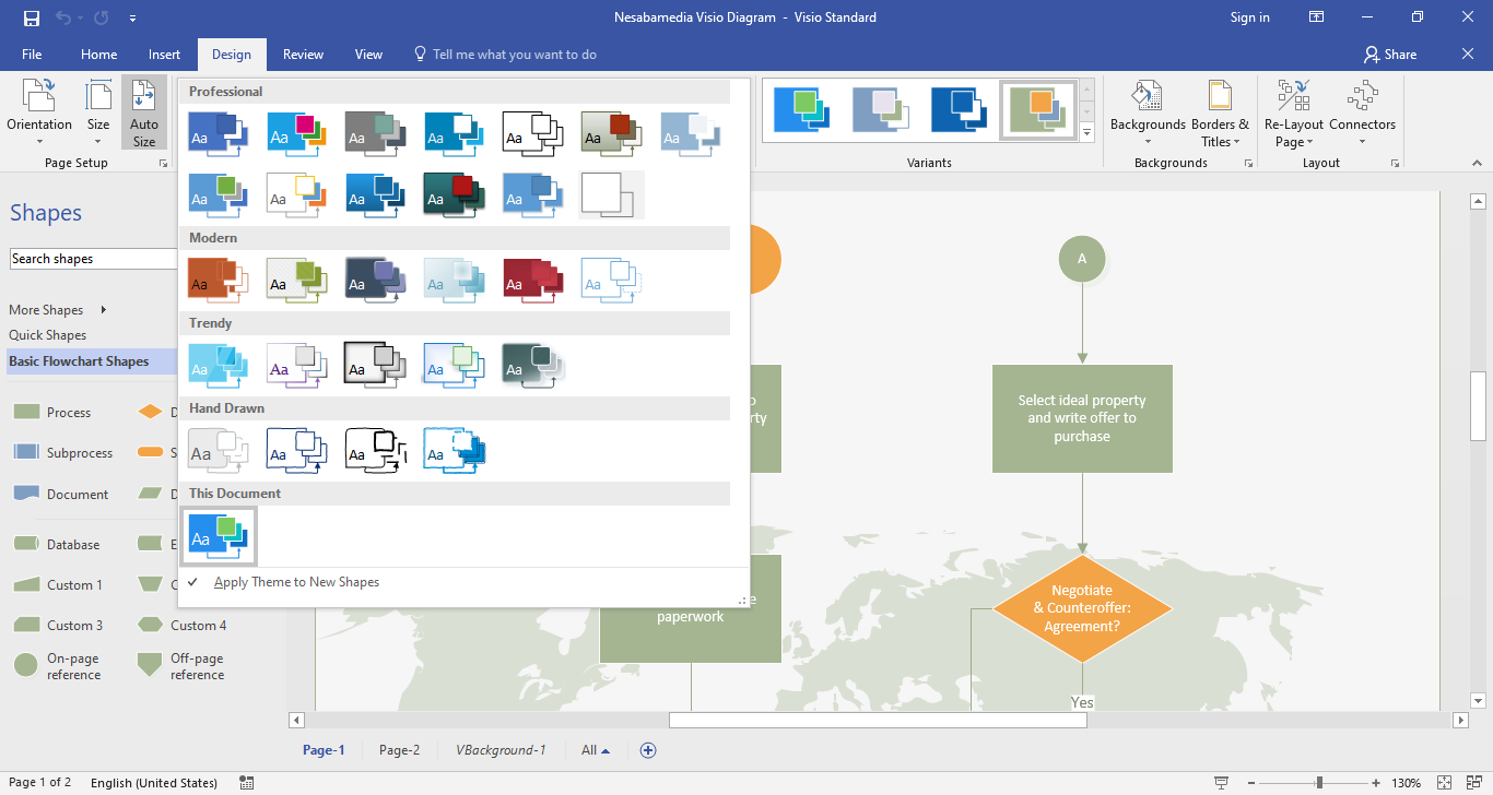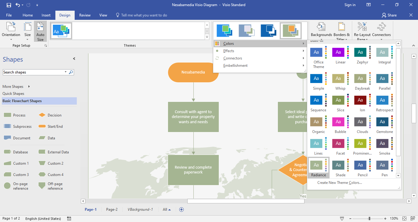 After you finish creating a diagram, you can pick any of the built-in themes in Vision 2016 to apply it to your diagram. Click the Design menu and find the one that best suits your diagram. Visio lets you preview your diagram’s new look in real time as you hover over a theme. Once you find one that you like, click it and the theme will be applied to your diagram immediately.