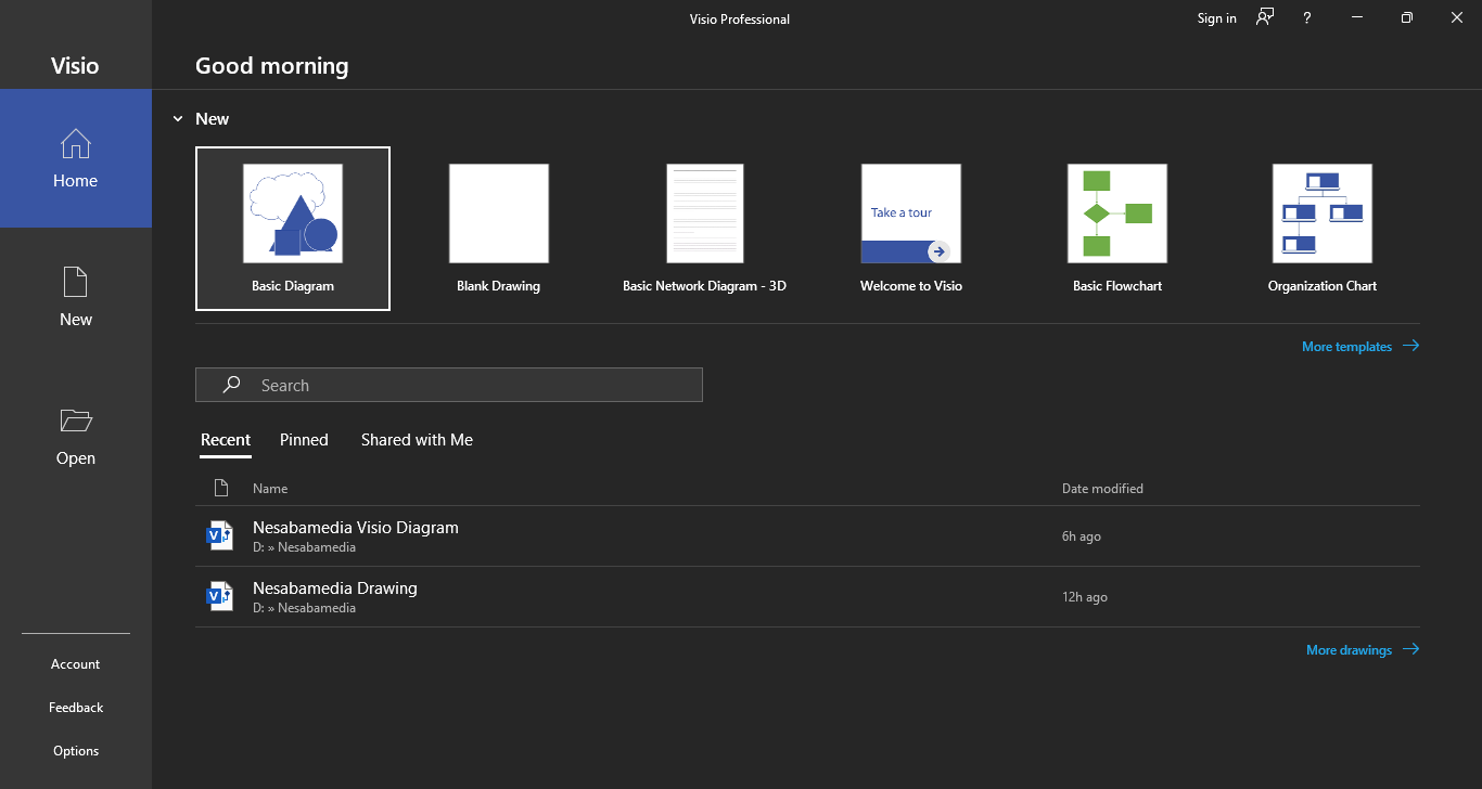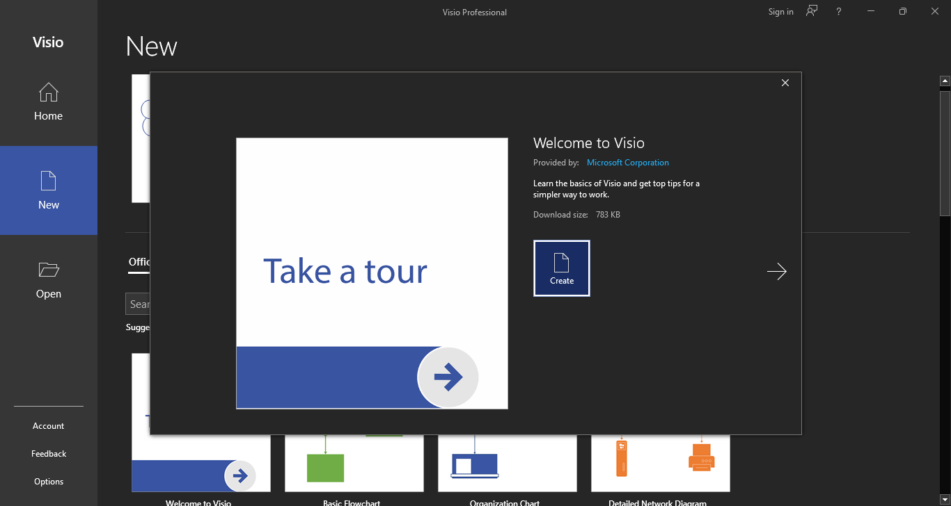 If you set Windows to dark theme, Microsoft Visio 2021 will launch in dark mode automatically. From there, you’ll see a number of free templates ranging from Basic Diagram to Audit Diagram. Let the program connect to the internet and you’ll see more templates available in the New view.
