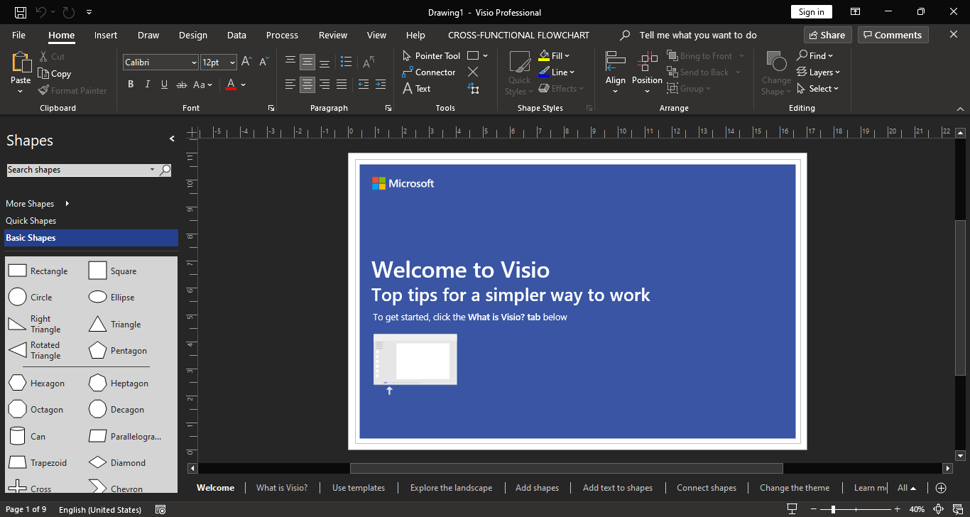 If you use other Microsoft Office applications such as Word and Excel, you might feel at home the moment you open the editor window. The upper area is dominated by the ribbon, and the rest is the area where you’ll work with your diagram, which is usually split into two sections: the canvas on the right side and a small panel on the left that displays the list of shapes of the selected template.