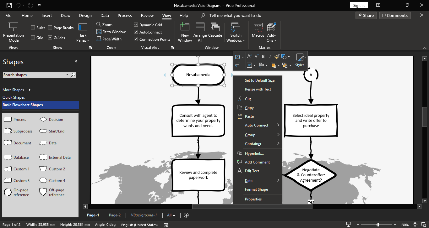 Visio 2021 also has many keyboard shortcuts assigned to a wide variety of actions. They make it faster to perform common tasks like zooming in and out, grouping shapes, switching between pages in the drawing, selecting tools such as Pointer or Connector, and moving between shapes, among others.