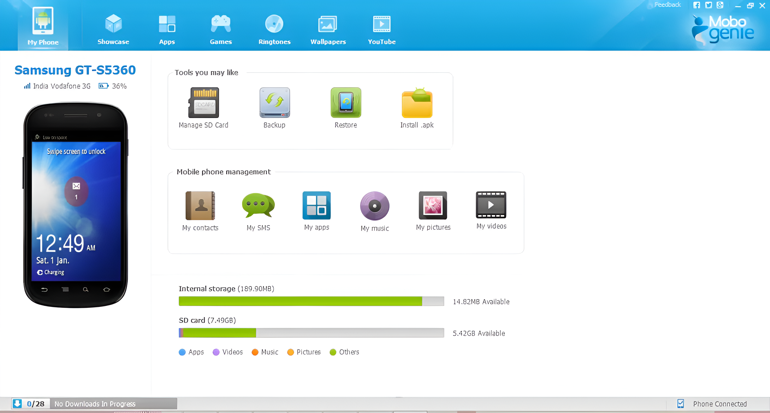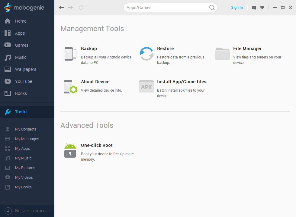 The home section of Mobogenie displays the picture of your phone along with three icons that represent its main functions: backup, restore, and file manager. These functions are also accessible from the Toolkit menu where you can find all the management tools that Mobogenie has like device information viewer, applications and games installers, and one click root.