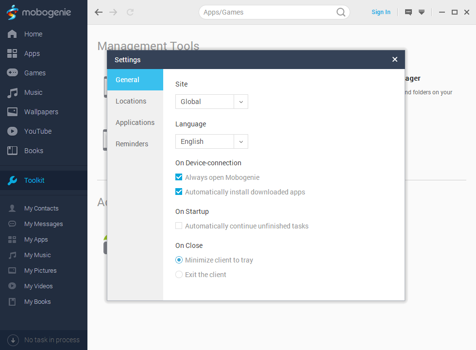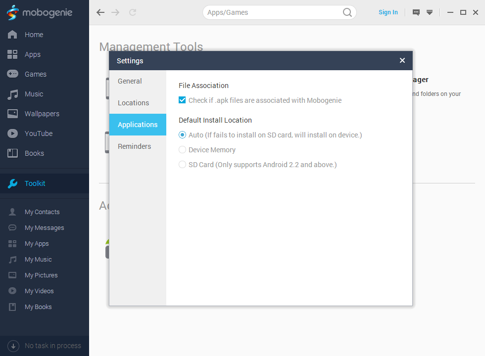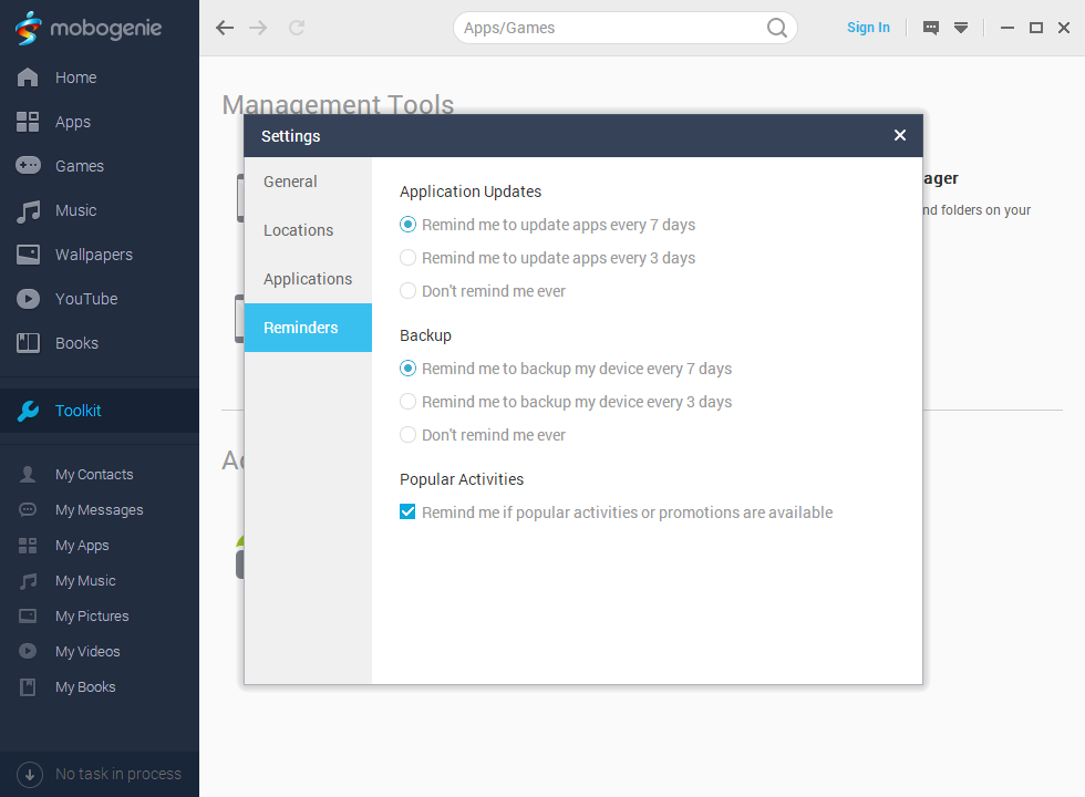 By default, Mobogenie launches itself when it detects an Android phone connected to your computer. It also automatically installs downloaded applications, minimizes Mobogenie interface to tray when you click its close button, checks .apk associations, reminds you to update and back up applications once a week, and reminds you when promotions are available.