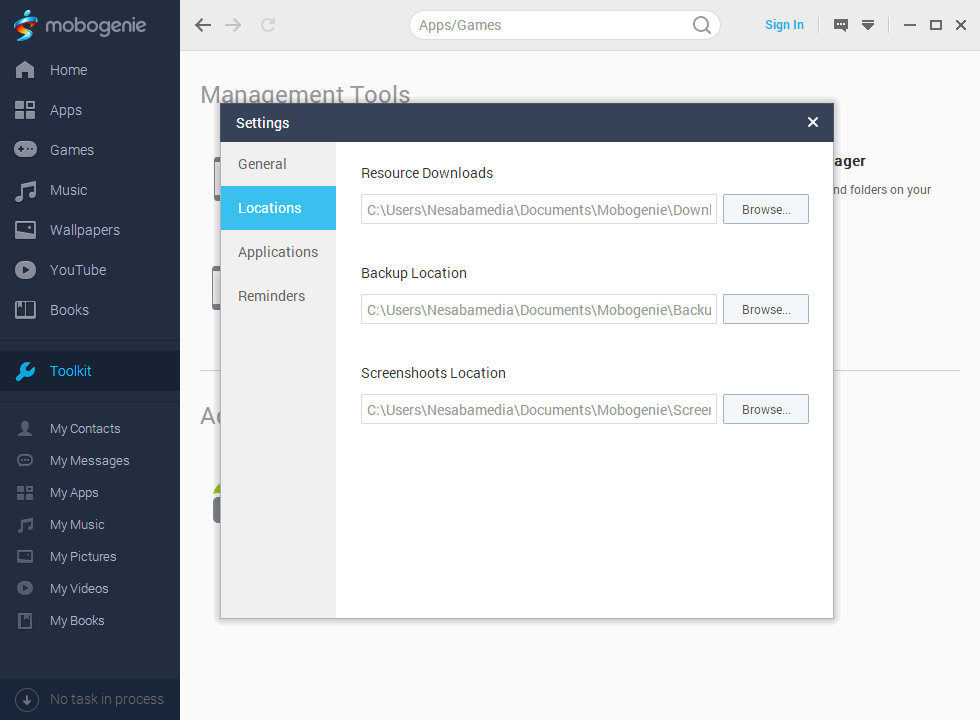 When you download content, back up your Android data, or take a screenshot, Mobogenie saves them into their default folders. In the Settings window, these folders can be seen and edited by clicking the Locations menu.