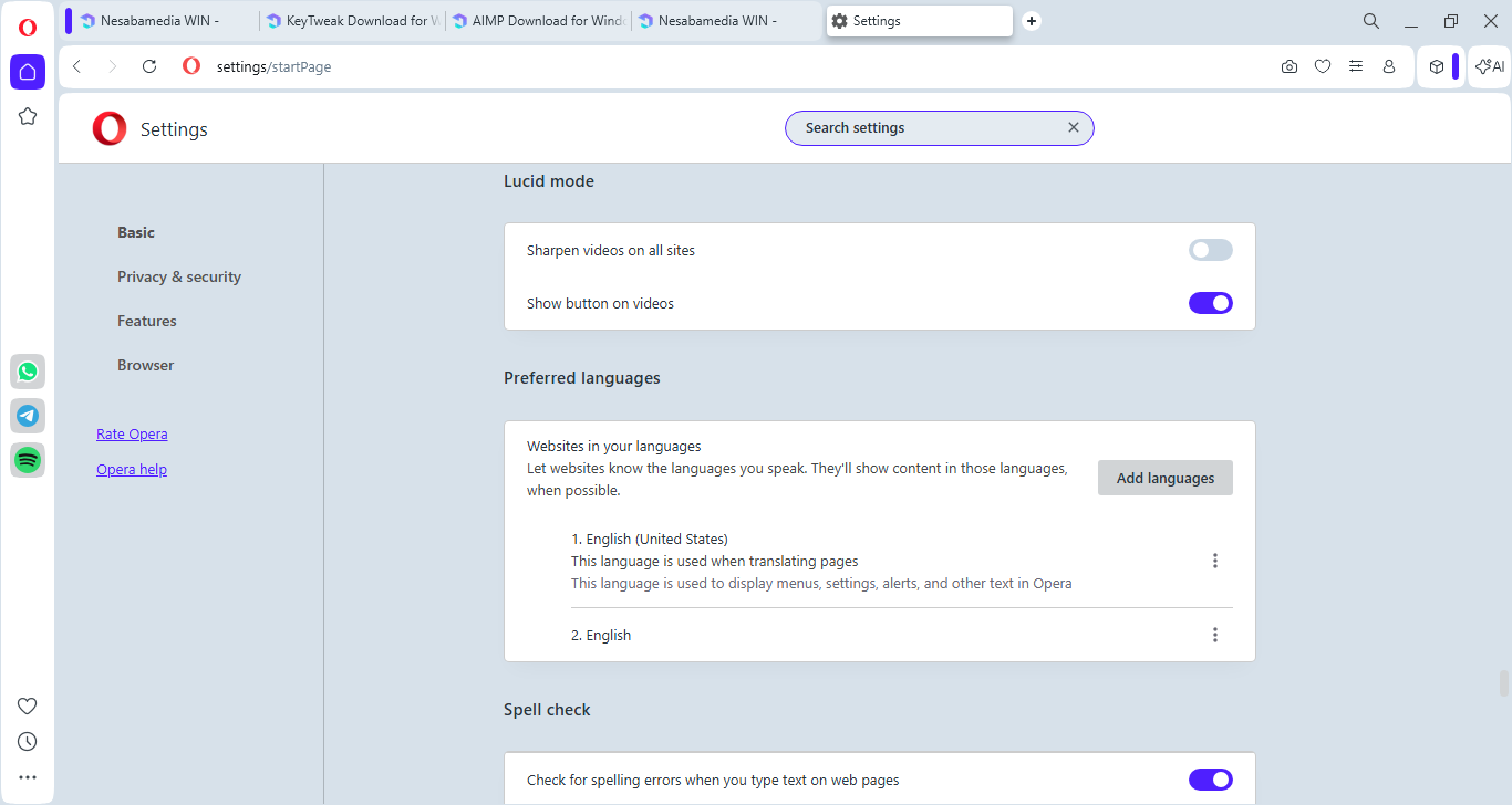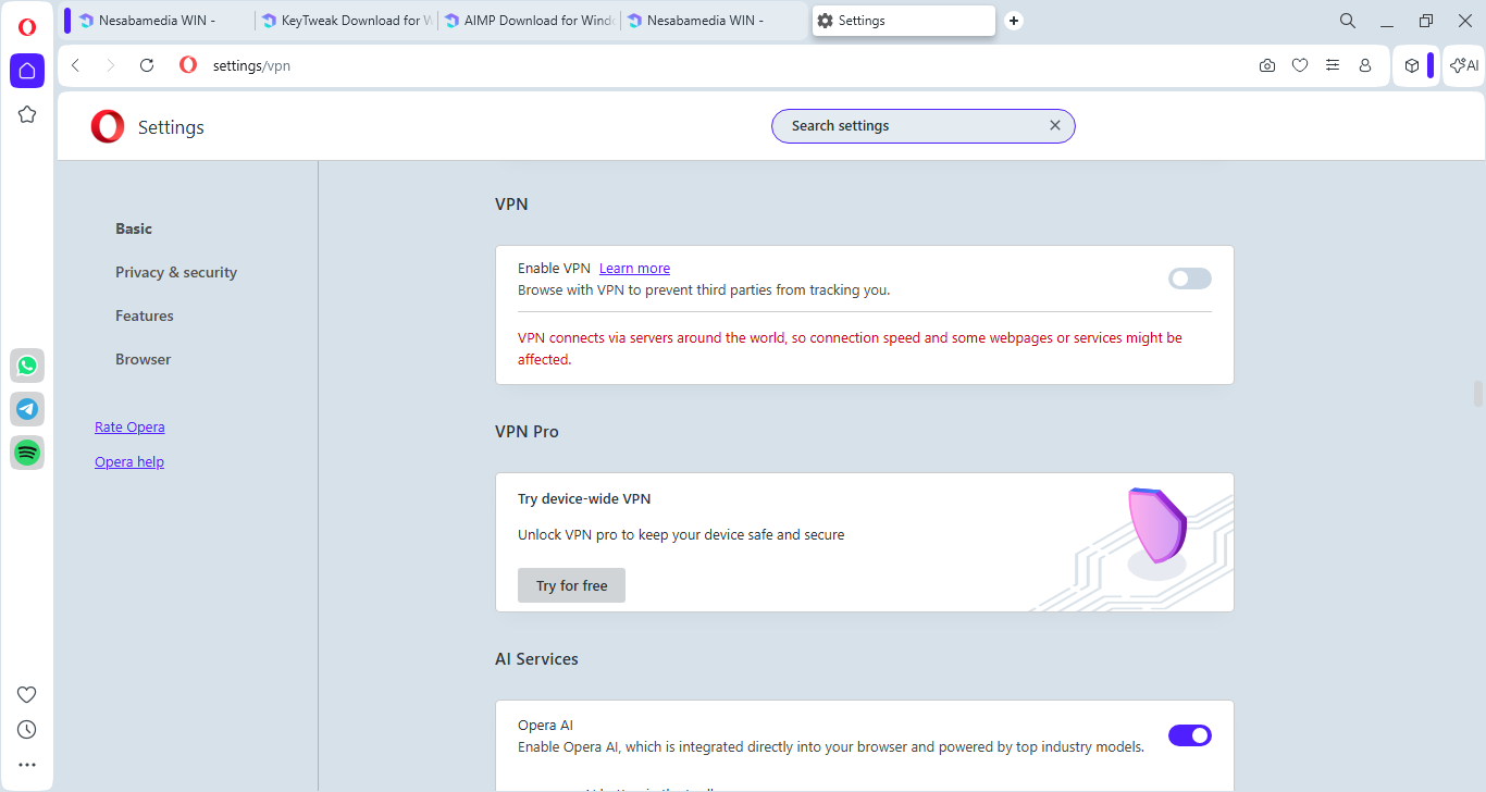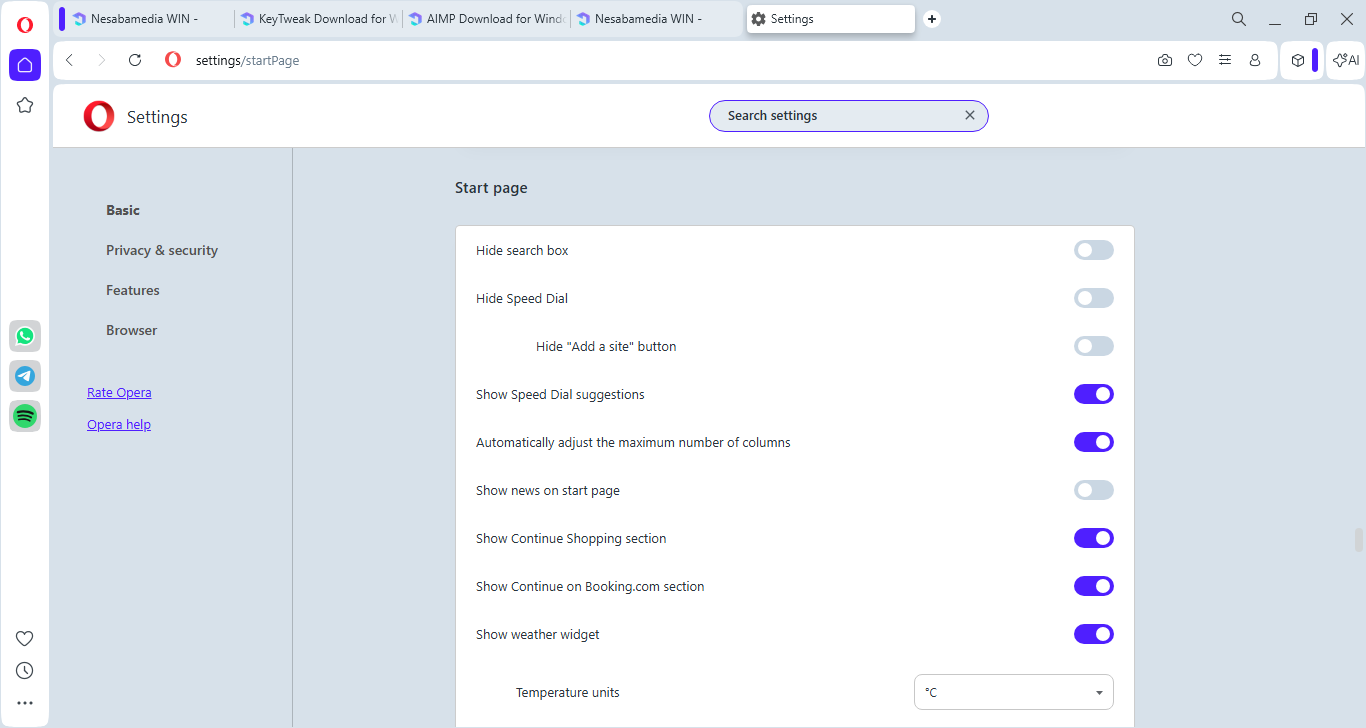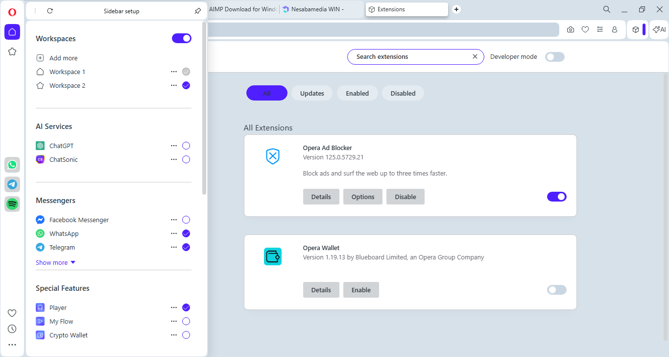 On the left side of the browser, there is a sidebar that provides a quick access to media socials ( TikTok, Instagram, Twitter, and VK), instant messaging services (WhatsApp, Facebook Messenger, and Telegram), special features (Player, My Flow, Crypto Wallet), workspaces, and various Opera tools.