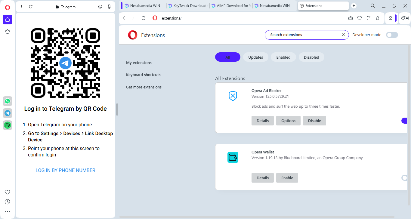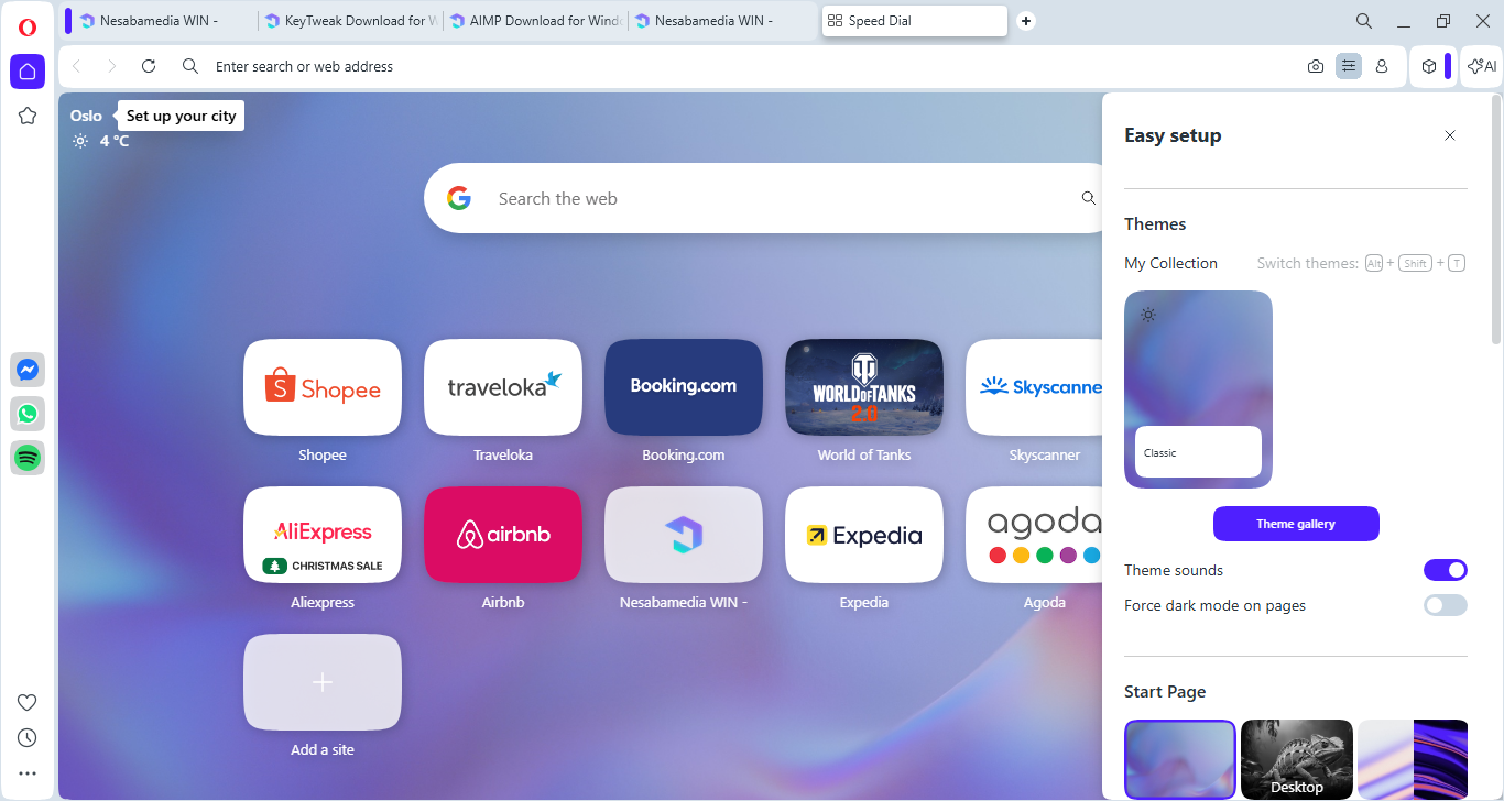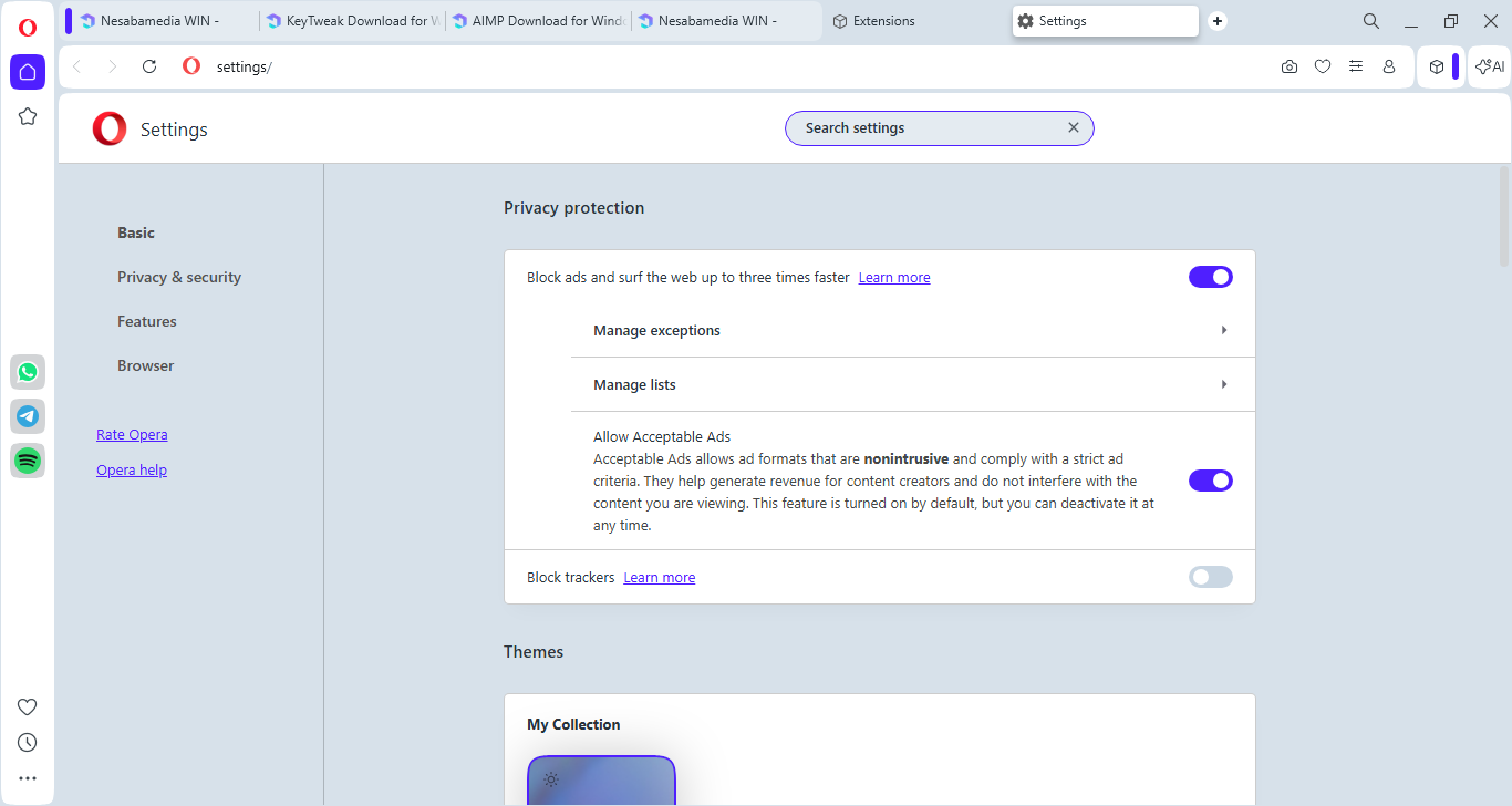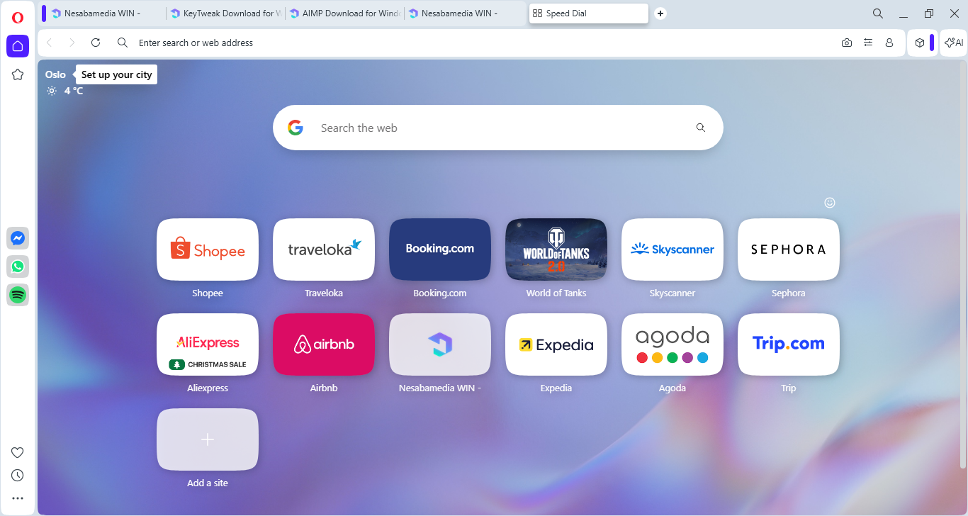 On the left side of the browser, there is a sidebar that provides a quick access to media socials ( TikTok, Instagram, Twitter, and VK), instant messaging services (WhatsApp, Facebook Messenger, and Telegram), special features (Player, My Flow, Crypto Wallet), workspaces, and various Opera tools.