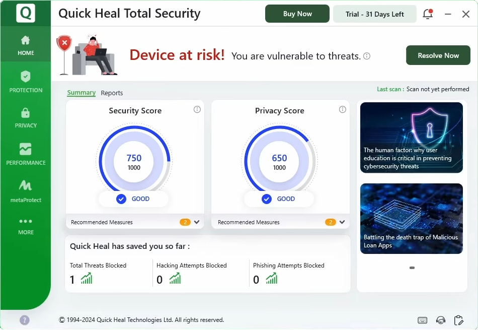 Using a computer without a security system in place is a bad practice, especially if you use it for banking activities. Even visiting a website can put you in danger. Your login details could be stolen and your data could be locked for some ransom. This is the reason why a security suite like Quick Heal Total Security is important.