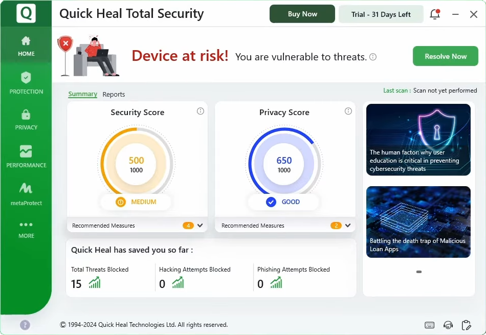 One of the common threats that many have fallen victim to is phishing. Quick Heal Total Security provides a security component to prevent you from experiencing the same horror.