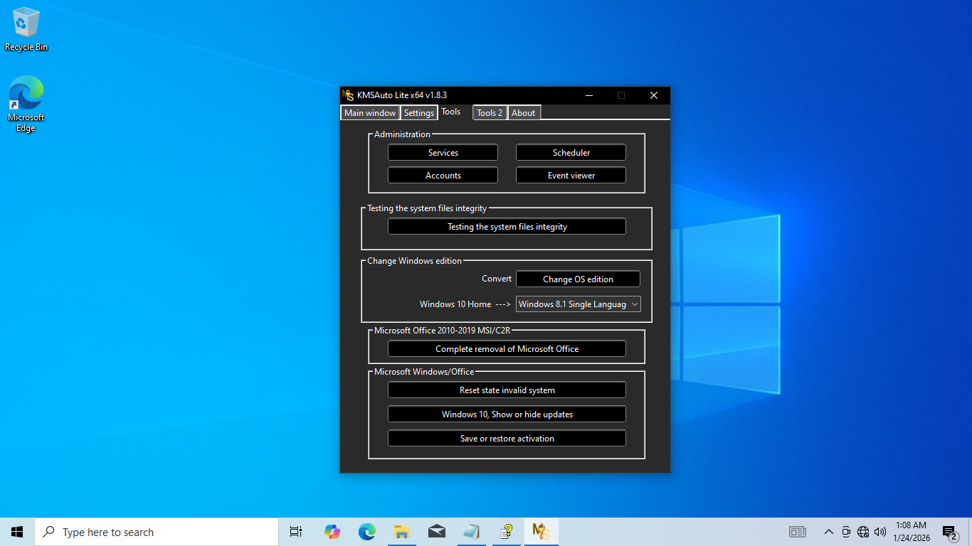 Ratiborus KMS Tools also has tools to change your operating system edition, save or restore activation, test the system files integrity, delete unused Office updates, delete KMS, disable Defender, download Microsoft Office, and create Microsoft Office ISO.