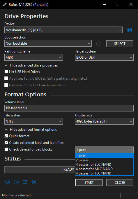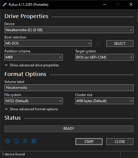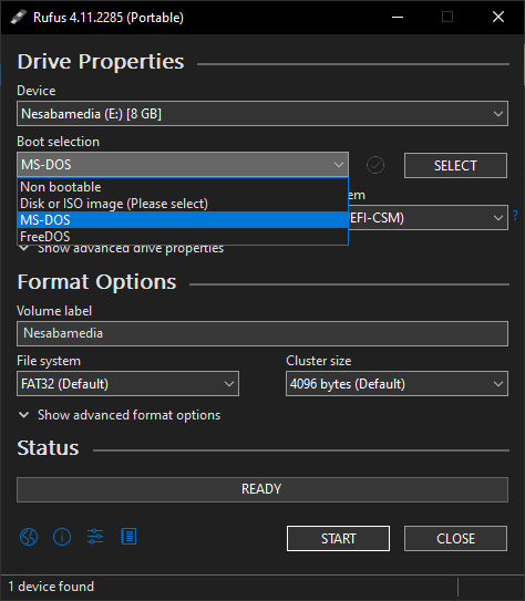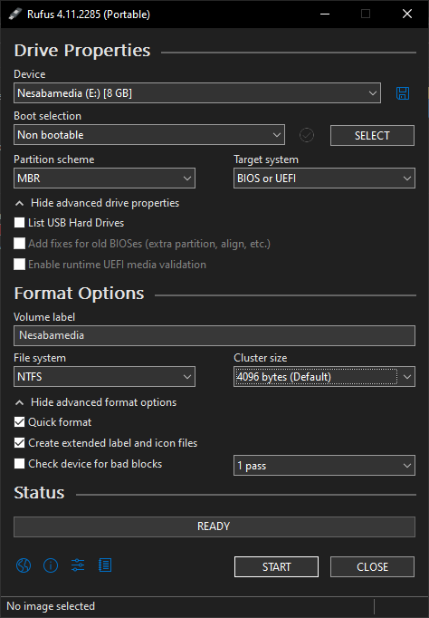 Rufus detects your USB drive automatically. The name of the device shows up in Rufus’s interface once the detection is successful. After that, preparing a Windows bootable USB drive is as easy as selecting an ISO image and then clicking the Start button. It lets you make some adjustments if you want more control. You can, for instance, choose a partition scheme and cluster size.