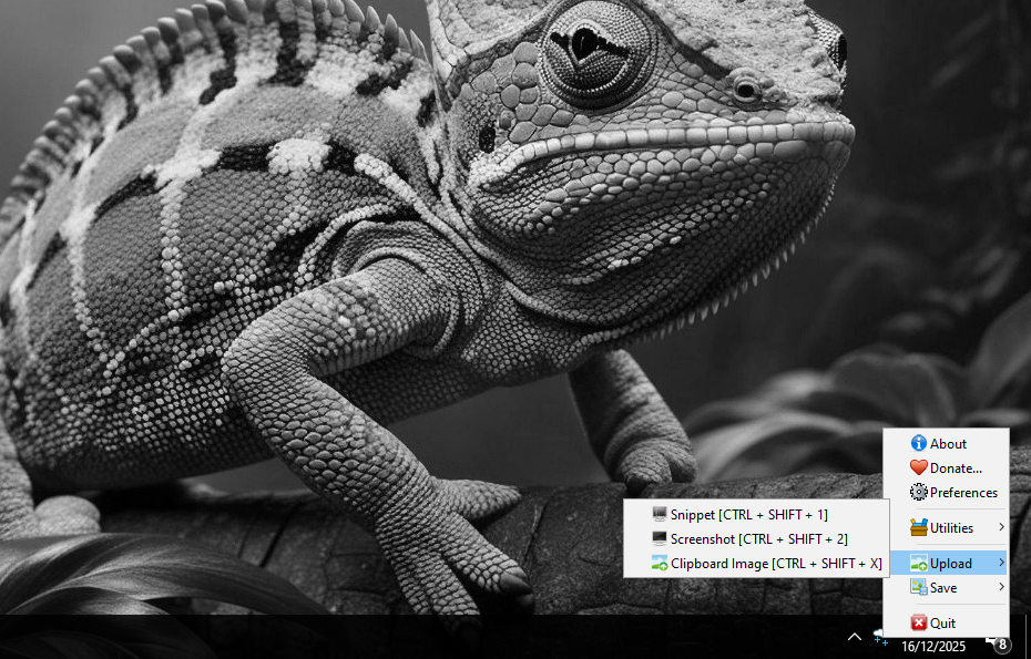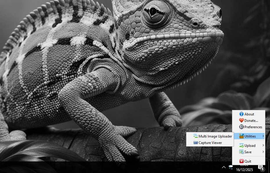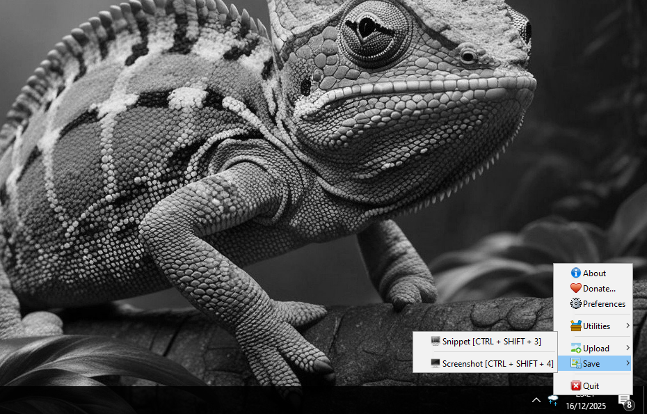 Every main action in Snipping Tool++ can be executed with a customizable hotkey. If you forget which hotkey to perform a certain action, you can right-click on its tray icon to show the menu where you can find the commands to capture the screen.