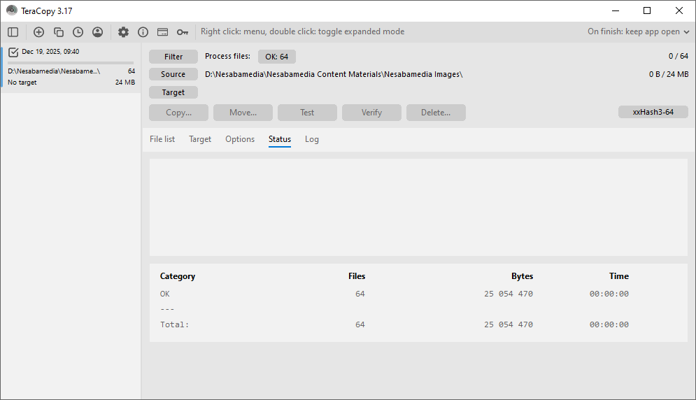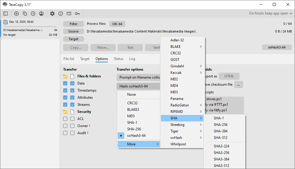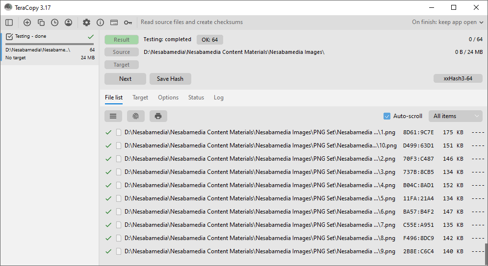 To make sure that the copied file is identical to the original one, you can verify the file transfer either manually or automatically. It takes longer to complete the whole process when the file integrity verification is enabled, but it is worth the wait. After the verification is successful, the hash file can be saved in the same folder where the copied file is stored.
