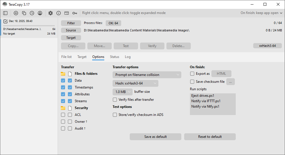 If a file in the destination folder has the same name as the file being transferred, you will be asked to choose which action that Teracopy must perform: skip, rename, or overwrite. The selected action can be set as default so that you don’t have to confirm it repeatedly.