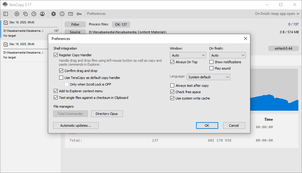 Teracopy also keeps a history of every file you transfer. The history is displayed on the left panel and deleted after one week by default, which can be shortened to one day, or set to permanent, or set to never keep the history.