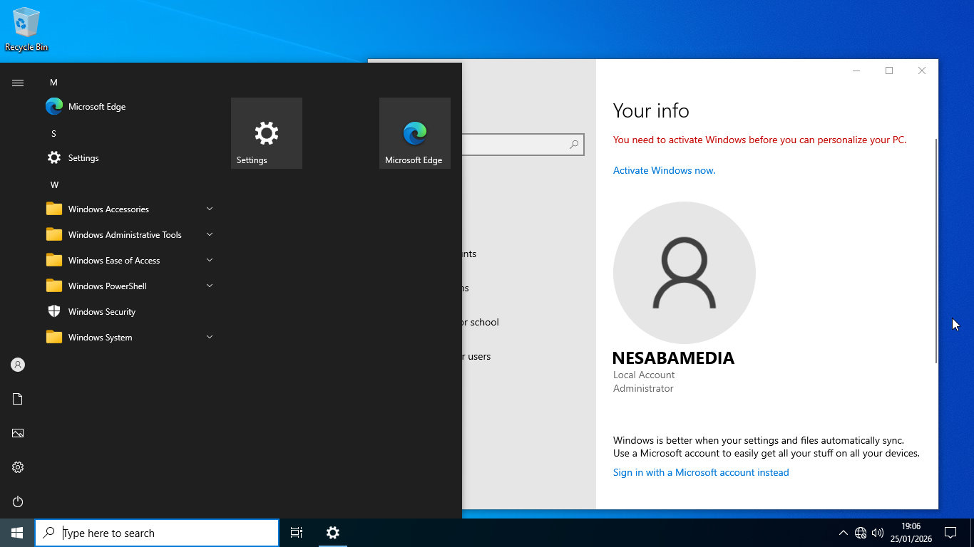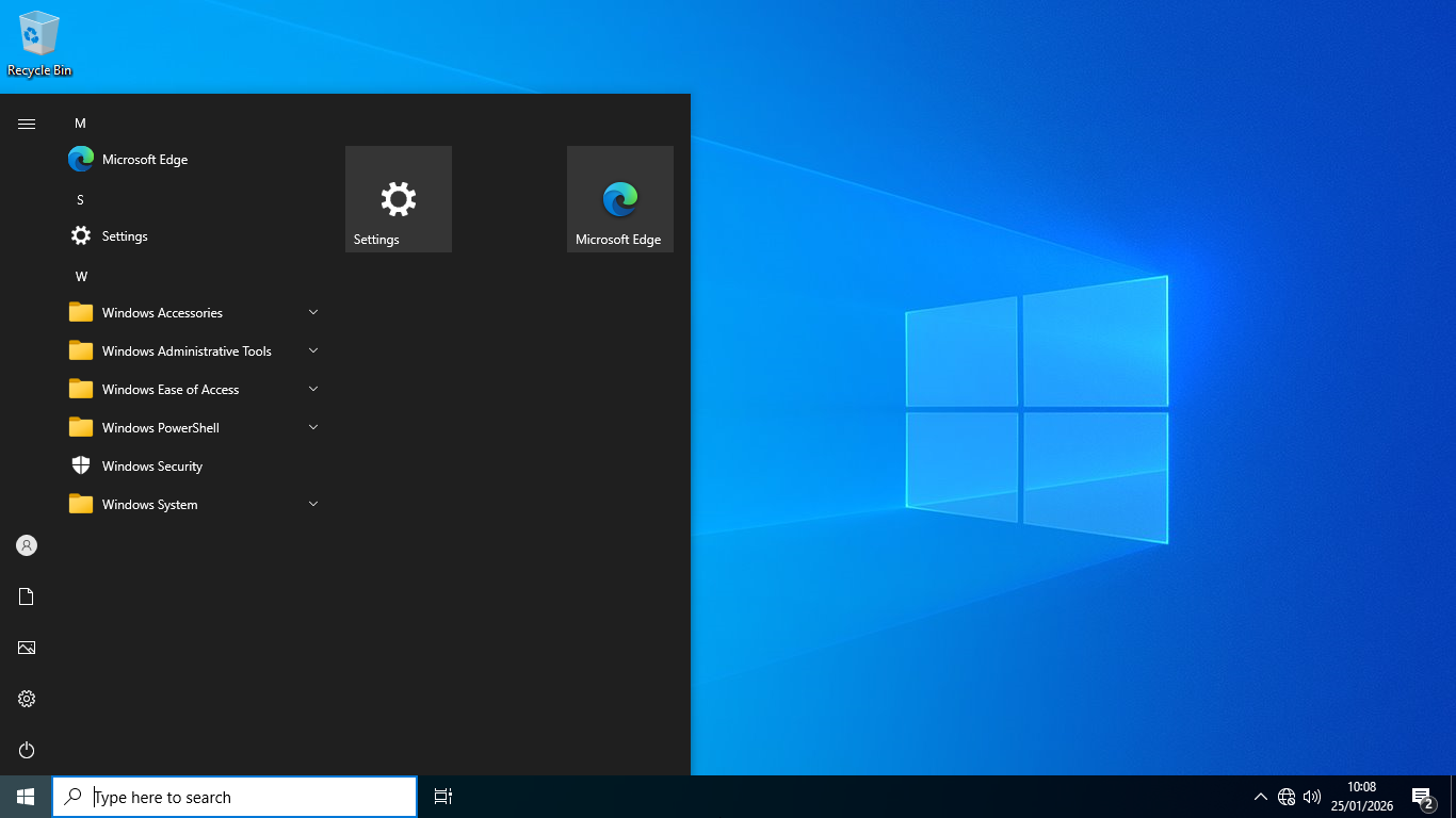 Once you finish installing Tiny10 and you’re at the desktop, you will see that it looks just like the regular Windows 10. The first sign that it is different appears when you click the Start menu. While the overall look remains the same, some features are missing from the list.