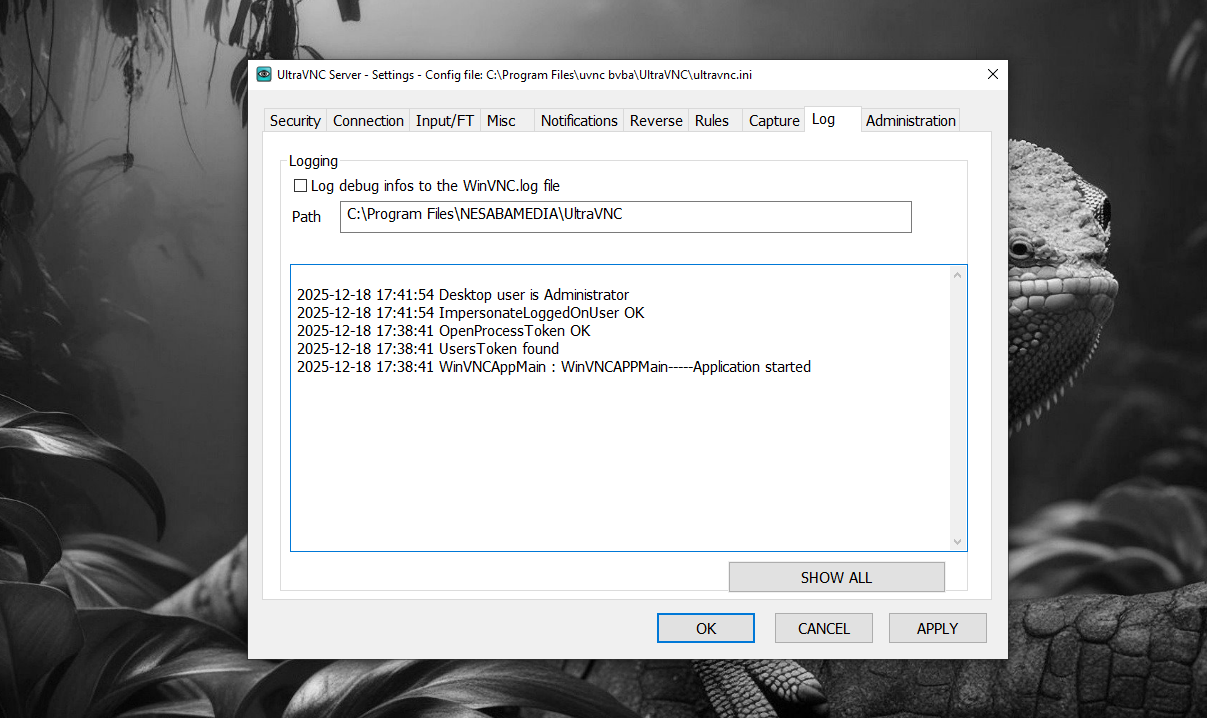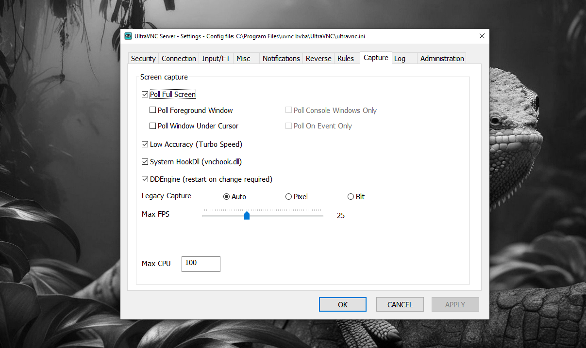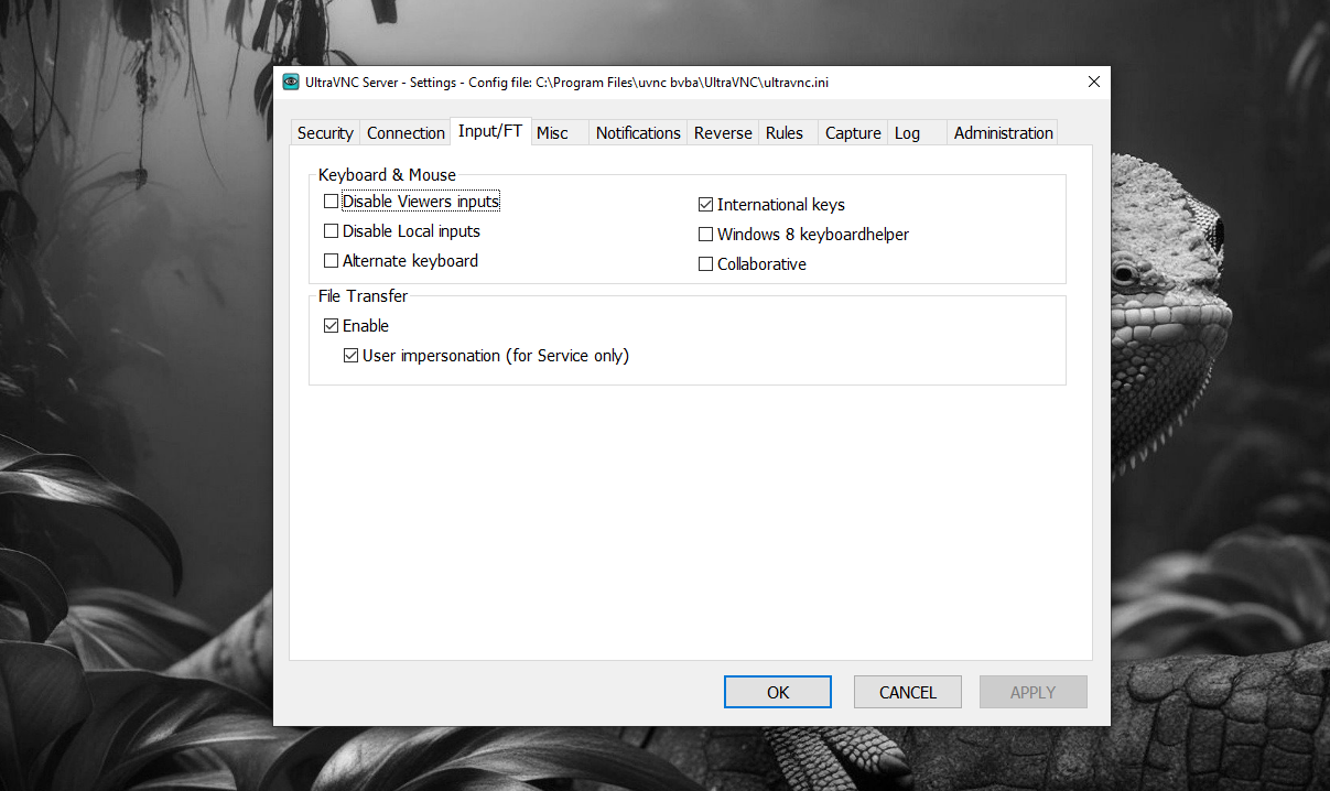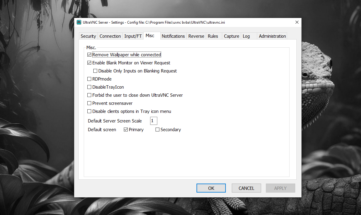 If you move to the Display tab, you can change the server resolution, hide scrollbars, show toolbar, auto scale, and more. There are seven tabs in total. Each comes with a set of options that allow you to fine tune UltraVNC so that it works exactly like your expectation.