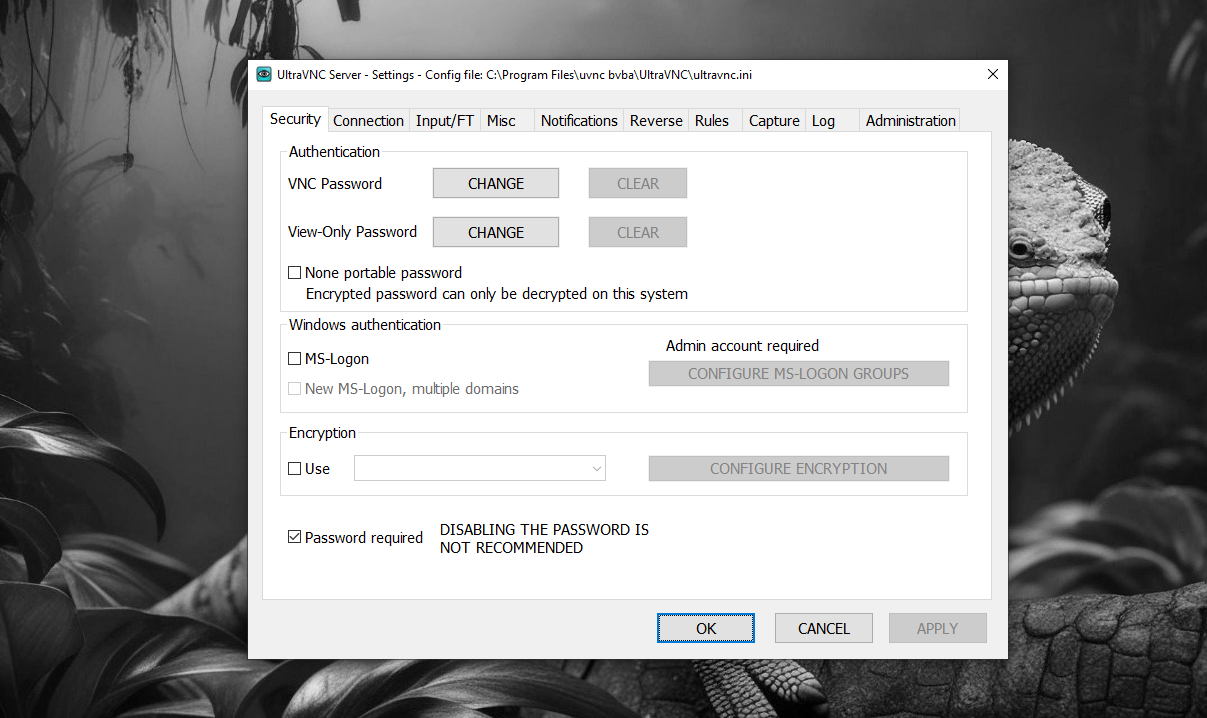 An optional DSM Encryption is available to secure communications. In the Security tab, other than the option to enable the encryption, there are several other options: only allow encrypted servers, only servers with password, disable clipboard transfer, auto accept incoming, hide menu, and custom notification on connect.