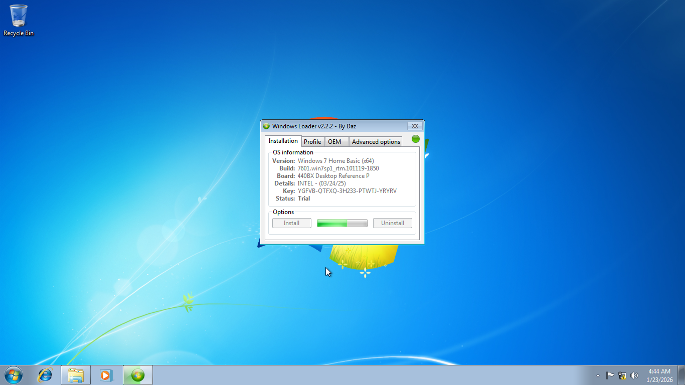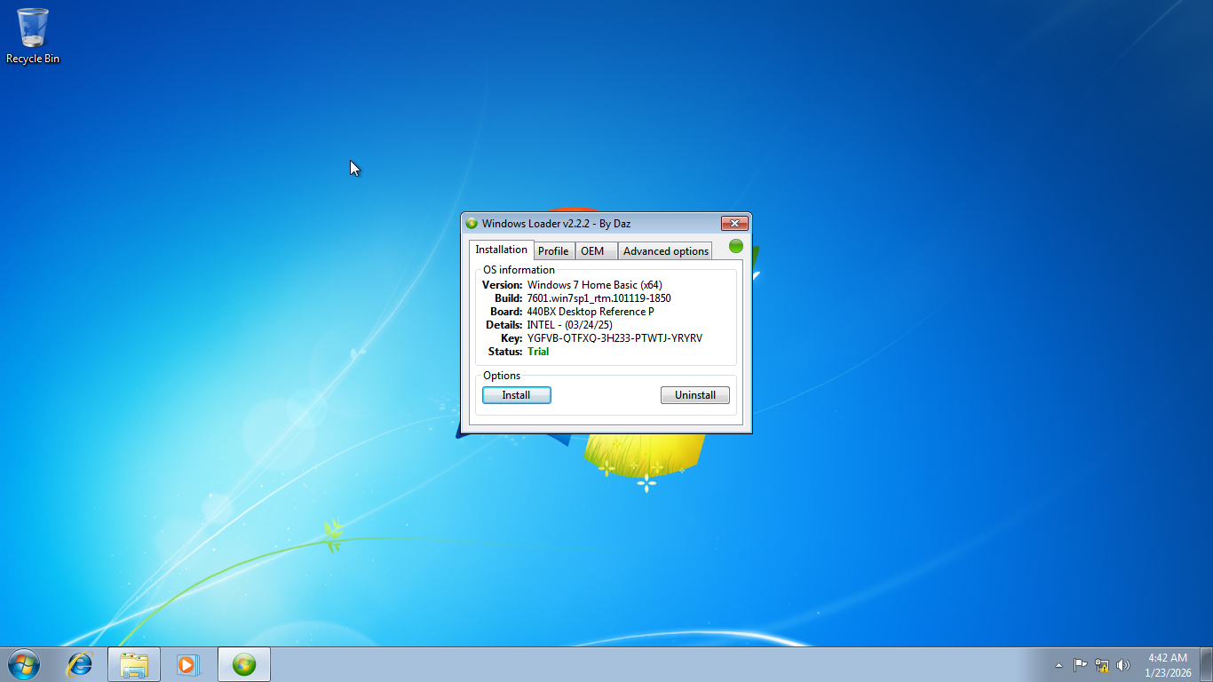 It has four tabs: Installation, Profile, OEM, and Advanced Options. The first tab you’ll see is the Installation tab, which displays your operating system information such as its version and product key. There are two buttons below the information which are used to install or uninstall the loader.