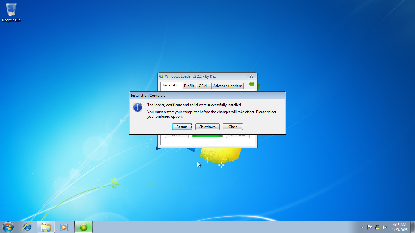 Activating Windows 7 with the loader is dead easy. Just click the Install button to install the loader, which will modify certain system files and registry entries, as well as automatically perform the other necessary steps to get the operating system fully activated. The whole process takes a few minutes to finish, and once it is done, you need to restart your computer to finalize the activation.