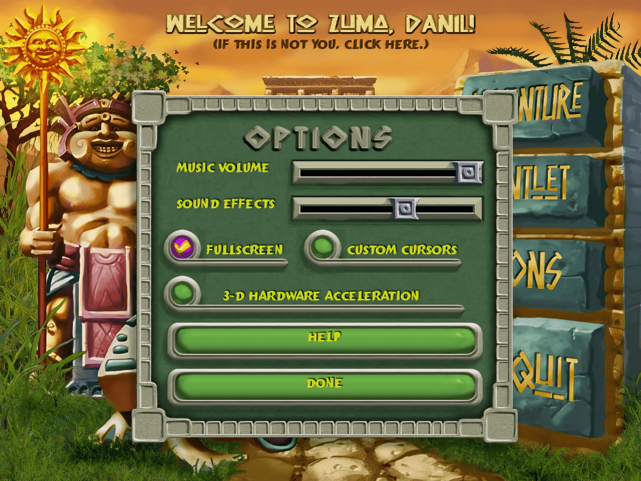 Zuma Deluxe is primarily themed around Aztec and Mayan civilizations. In addition to the game levels that are organized into various temples with evocative names that might make you feel like you are thrown into a lost civilization’s labyrinth, the feedback cues like the chant “zuma!” also strengthen the ancient vibe of the classic game.