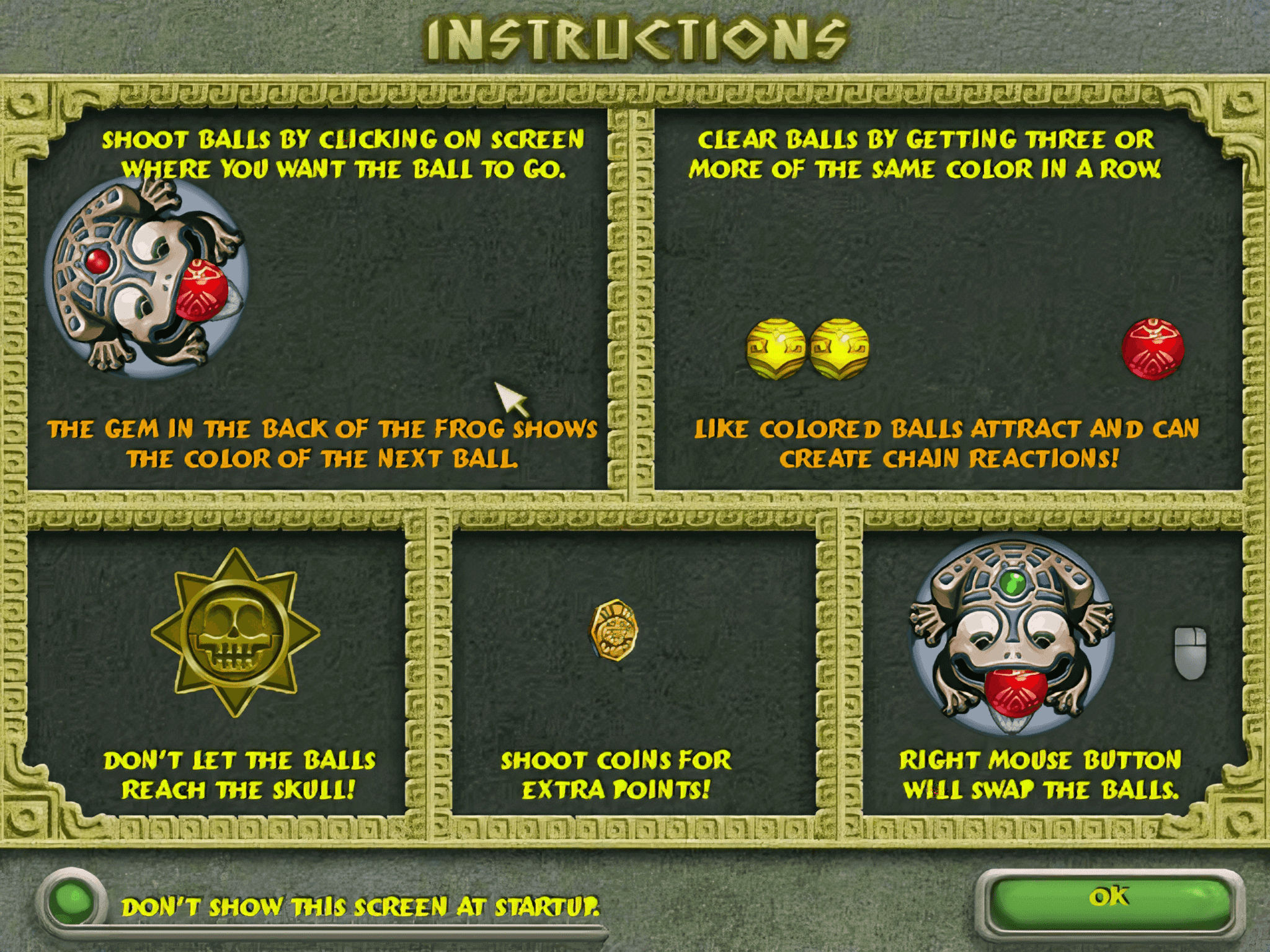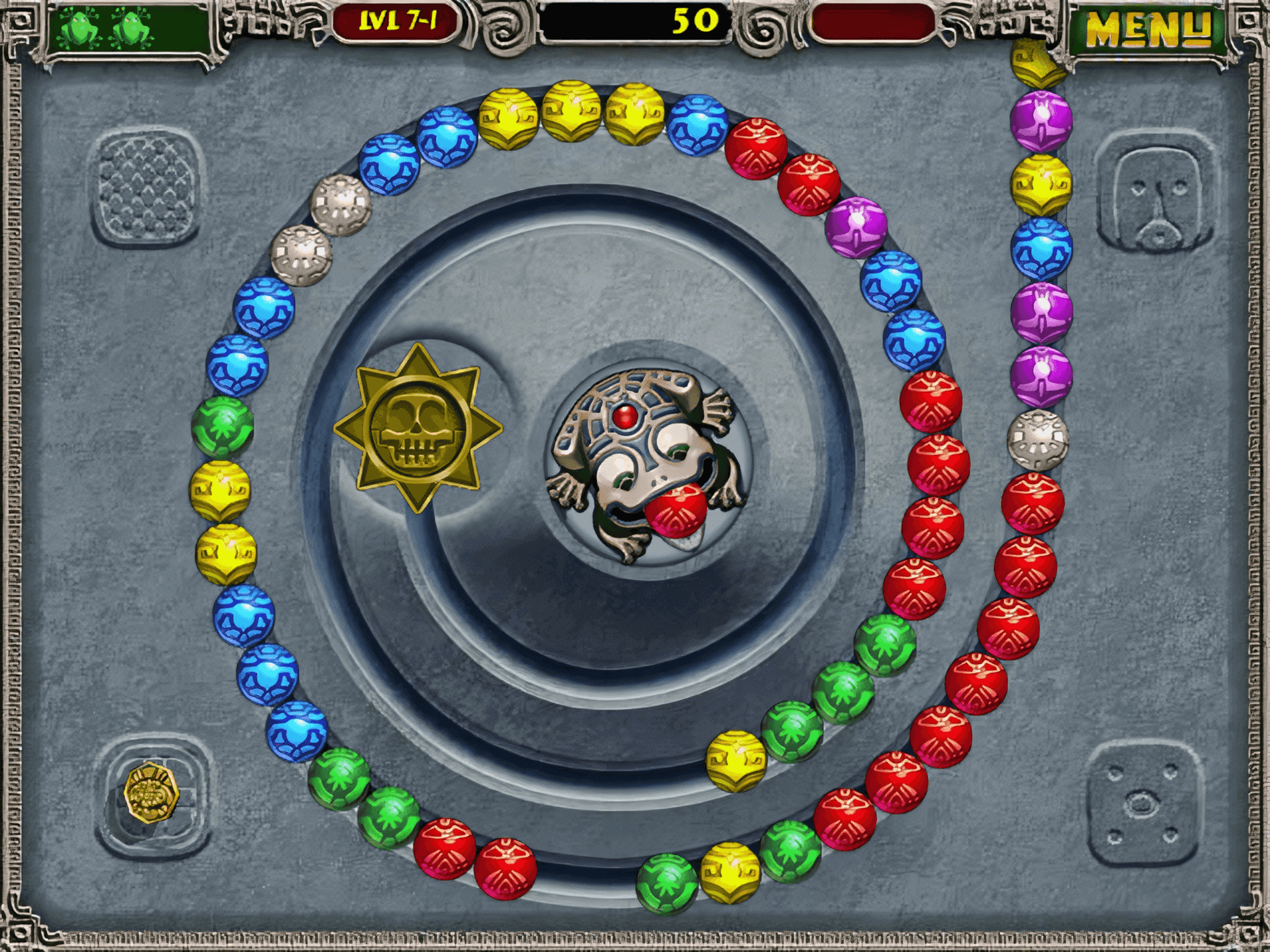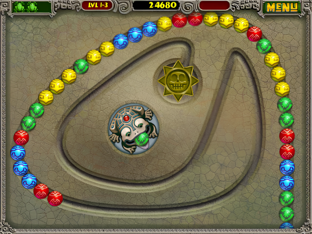 In this game, you control a stone frog idol that holds a colored marble in its mouth. Your task is to fire the marble to match colors in the moving chain of marbles snaking along the track. After each shot, a new marble appears, keeping the action continuous and fast-paced.